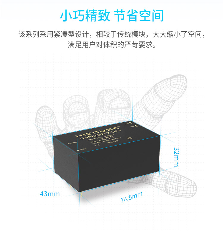 品牌:HIECUBE/高能立方 型号:GaN20N75P1 隔离耐压:3000VAC 输出电压精度:±1% 电源类别:AC-DC电源模块 模块质保年限:三年